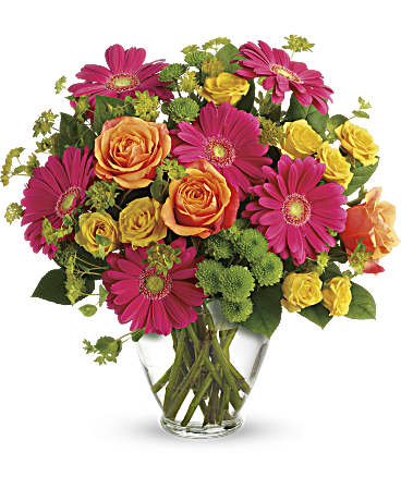 Encourage a young woman or beloved friend to follow her rainbow with this bright, vivacious bouquet. Featuring hot pink gerbera daisies and orange roses, the youthful arrangement pops with summery fun!