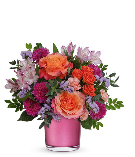 This vibrant floral arrangement is a perfect gift to send to loved ones. It features a delightful mix of orange roses, orange spray roses, purple chrysanthemums, pink alstroemeria, and lavender statice. Nestled in a shimmering pink vase, this bouquet adds a pop of color and joy to any occasion. The...