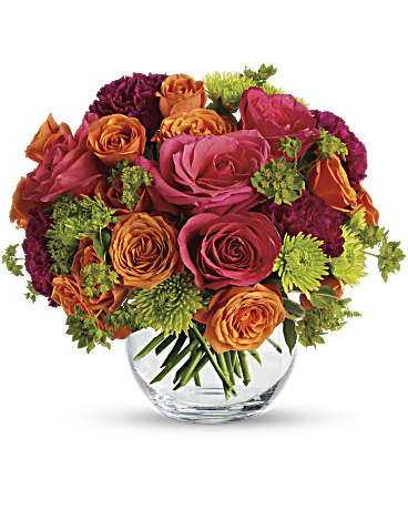Show your happy side by sending this gorgeous bouquet of hot pink roses, orange spray roses and other fabulous faves in a charming glass bubble bowl. They'll love the gift, and you for having such amazingly good taste. This enchanting bouquet includes hot pink roses, orange spray roses, green button...