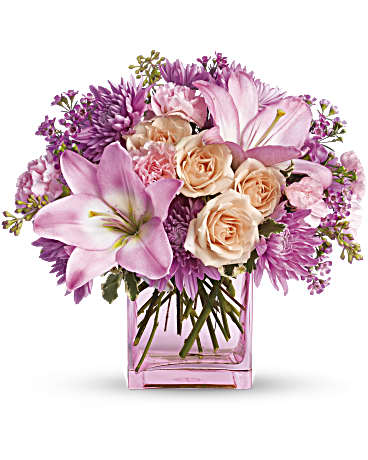 Peach, pink and lavender blooms are a sweet and innocent way to show your affection. Boasting a beautiful variety of flowers, this chic bouquet of feminine colors is full of texture and makes a fabulous gift.