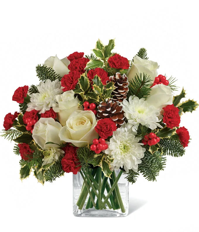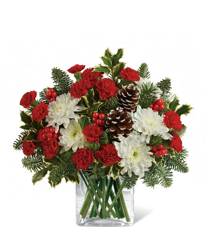 Send a charming holiday gift that’s brimming with festive beauty. This delightful arrangement features vibrant red mini carnations, elegant white roses (included in deluxe and premium sizes), and fluffy white cushion spray chrysanthemums. Accented with Douglas fir, noble fir, variegated holly, natural pinecones, and bright red berries, it’s artfully arranged in a clear cube vase for a modern touch. Perfect for spreading seasonal cheer to loved ones or adding a warm, inviting touch to any space.