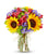 Take in the hues of a bright morning as the sun rises. This bouquet of flowers has a chic farmhouse style while still staying modern. Bright sunflowers surrounded by pink alstroemeria and green poms are displayed in a mason jar wrapped in raffia. The essence of a field of flowers in the early morning can be brought to your loved ones homes, and will charm anyone who sees it!