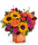 Bring warmth and cheer to any occasion with this vibrant arrangement. Featuring radiant orange roses, lively miniature orange carnations, sunny medium yellow sunflowers, and charming purple daisy spray chrysanthemums, it’s a stunning display of color and joy. Artfully arranged in a sleek coral cube vase, this bouquet is perfect for celebrating birthdays, sending smiles, or brightening someone’s day.