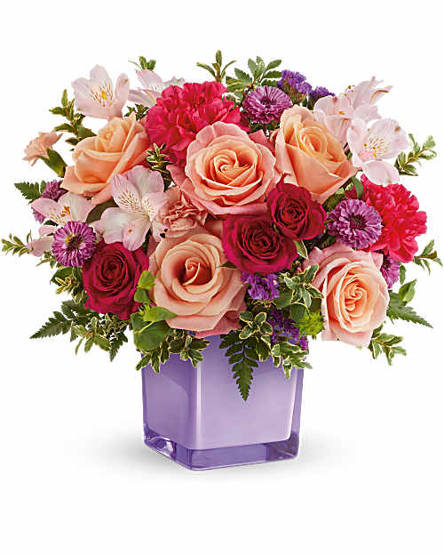 A treat for the senses, this bouquet blends peach, pink, and fuchsia blooms in a radiant purple cube. A refreshing burst of color that brightens any room with effortless charm.