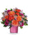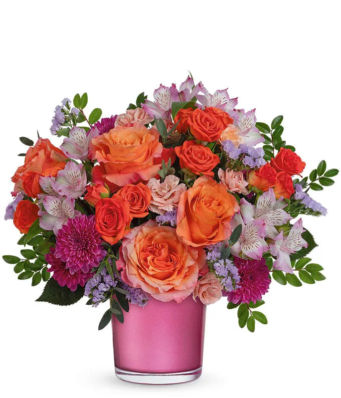 This vibrant floral arrangement is a perfect gift to send to loved ones. It features a delightful mix of orange roses, orange spray roses, purple chrysanthemums, pink alstroemeria, and lavender statice. Nestled in a shimmering pink vase, this bouquet adds a pop of color and joy to any occasion. The lush greenery provides a beautiful contrast, enhancing the vivid hues of the flowers.
